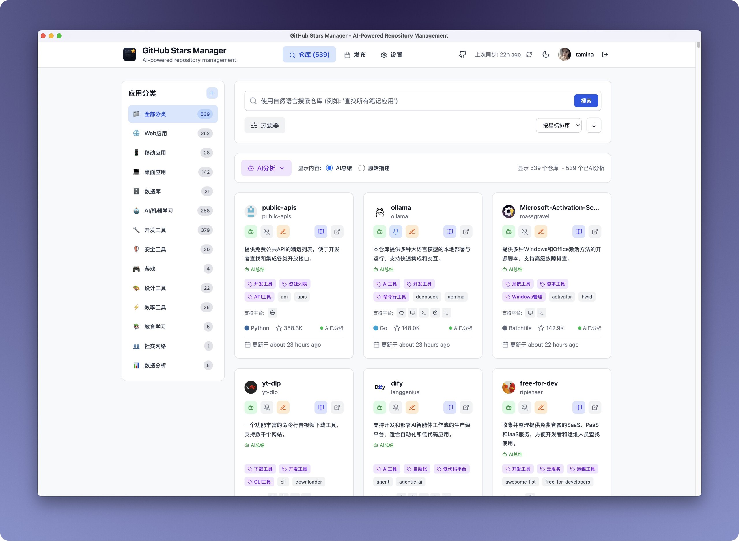 ▎软件介绍:一款用于管理 GitHub 加星仓库的工具,它可以通过 GitHub Token 自动同步你收藏的项目,并利用 AI 生成摘要、标签和分类,帮助用户更好地理解和整理仓库内容。